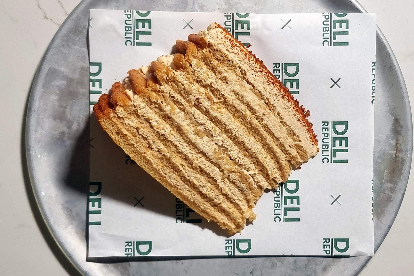 Baked in-house from scratch our signature Honey Cake is made from layers of honey spo