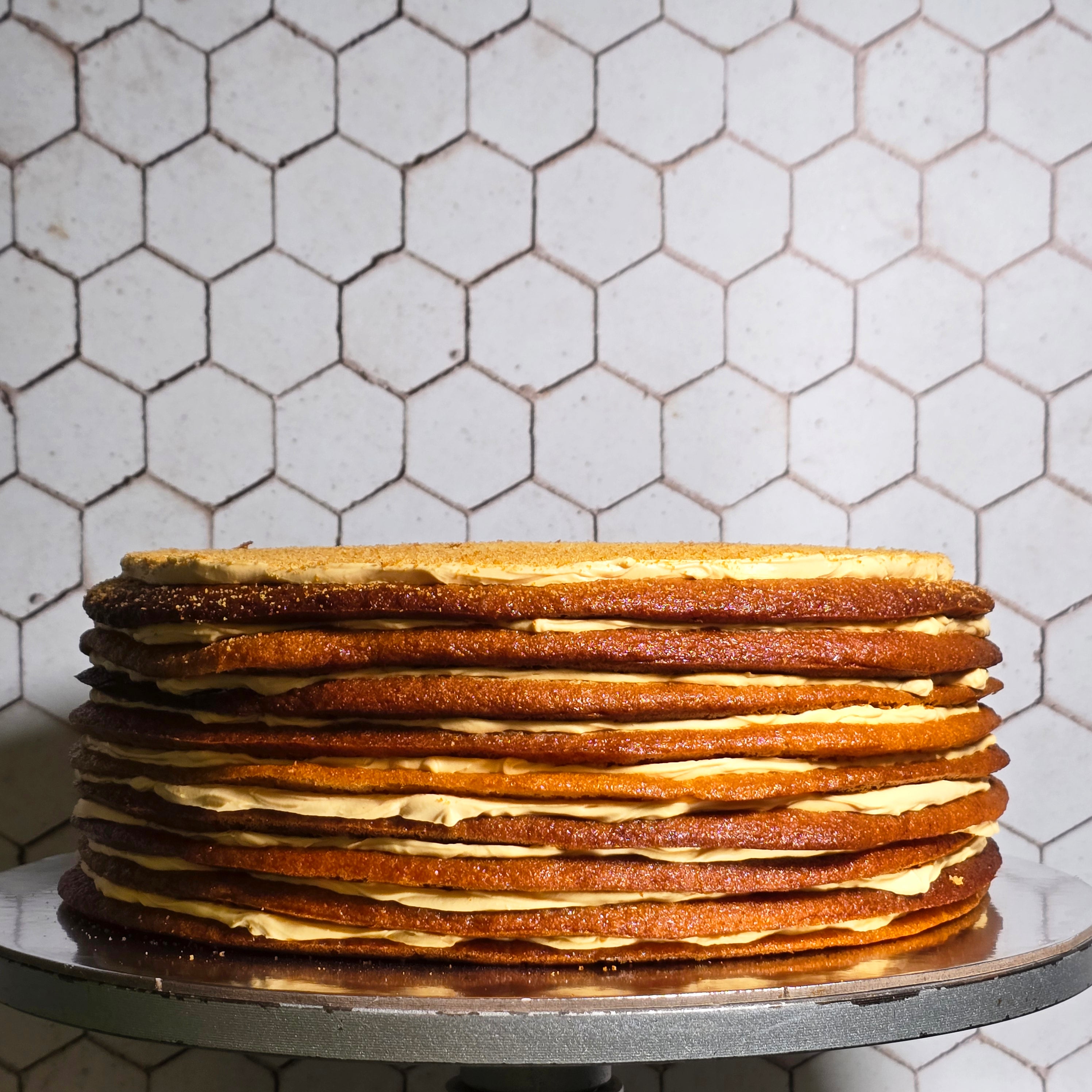 Baked in-house from scratch our signature Honey Cake is made from layers of honey spo